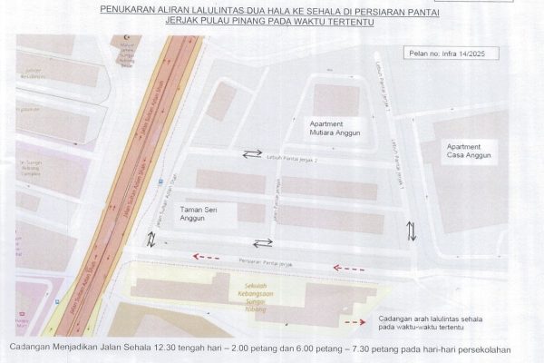 涉及道路范围是从班台惹雅街1(Lebuh Pantai Jerejak 1)通往苏丹阿兹兰沙路(Jalan Sultan Azlan Shah)方向的路段,将在学校上课日时段,即中午12时30分至下午2时,以及下午6时至7时30分改成单向道。